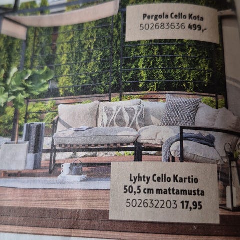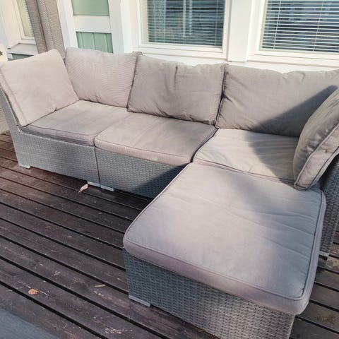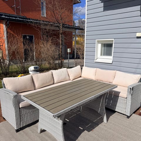 Brafab kulmasohva parvekkeelle tai terassille. Sohvassa on valkoinen runko ja harmaat istuin- ja selkätyynyt. Isuinosa koostuu kolmesta moduulista, jotka muodostavat yhdessä kulman. Tyynyt ovat irrotettavia ja pestäviä. Sopii ulkokäyttöön parvekkeella, terassilla tai pihalla istuinryhmänä. Ollut lasitetulla terassilla.