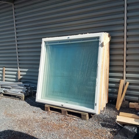 Yksiaukkoinen ikkuna, jossa suuri lasipinta. Kuvien perusteella ikkunan ulkomitat ovat noin 1780 x 1390 mm ja syvyys noin 210 mm (mitat arvioitu merkinnöistä, tarkat mitat kannattaa varmistaa paikan päällä). Valkoinen karmirakenne ja yksiosainen lasi. Sopii esimerkiksi omakotitalon tai muun rakennuksen ulkoseinään, kun tarvitaan isoa kiinteää ikkunaa luonnonvalon lisäämiseksi tilaan.