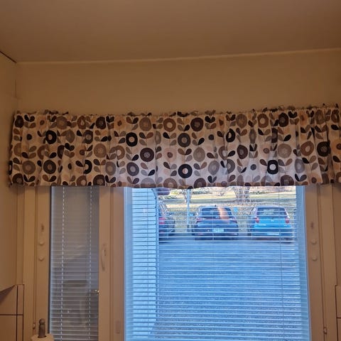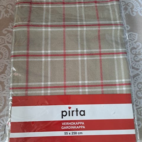 Myydään harmaa, ruudullinen verhokappa. Koko 54 x 250 cm. Hinta 10 euroa. Ei postitusta.