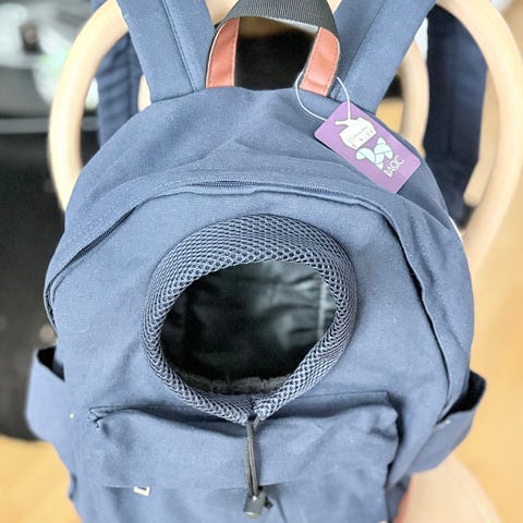 Siisti lemmikin kantoreppu koiranpennulle/kissalle tai pienelle koiralle. Oma pomeranian ei repussa viihtynyt. Repun voi laittaa selkään tai eteen. Materiaali puuvillaa, väri t.sininen