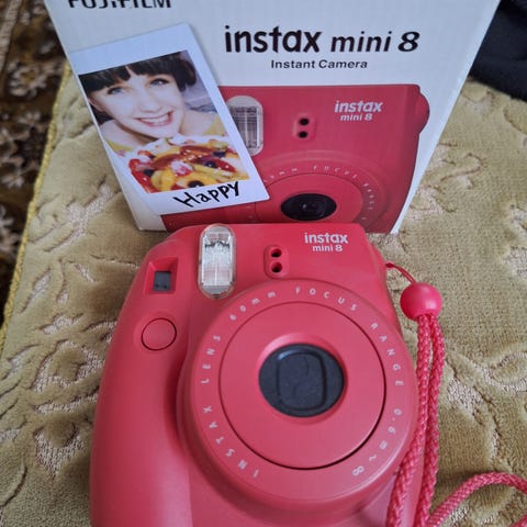 Fujifilm Instax Mini 8 instant-kamera valkoisena. Kamerassa on 60 mm objektiivi ja sisäänrakennettu salama. Käyttää Instax Mini -filmiä pienten välittömien paperikuvien ottamiseen. Sopii esimerkiksi arjen tilanteiden, juhlien ja matkakuvien kuvaamiseen, kun kuvat halutaan heti paperille.