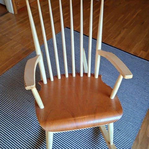 Muuten hyväkuntoinen keinutuoli, mutta istuinosassa pari halkeamaan, eivät haittaa käyttöä.