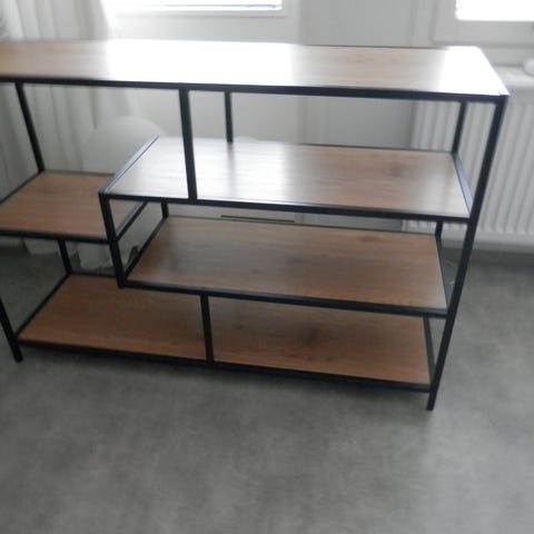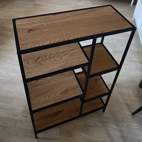 Jyskistä aikanaan ostettu hylly, jossa puiset hyllyosat ja mustaa metallia oleva kehikko