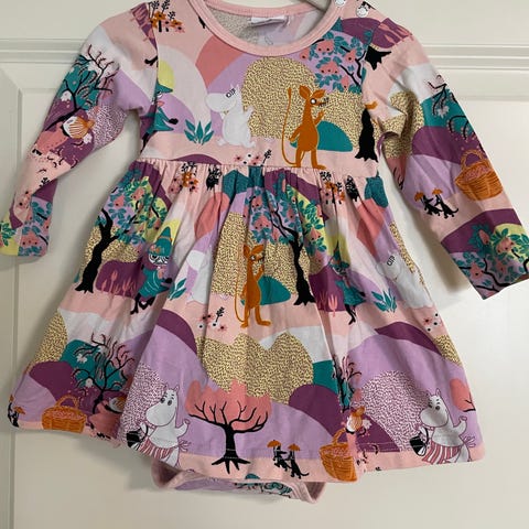 Muumit lasten mekko, koko 80. Pitkähihainen trikoomallinen mekko, jossa vaaleanpunainen pohjaväri ja monivärinen Muumi-kuosi. Pyöreä pääntie ja levenevä helma. Sopii tytöille arki- ja juhlakäyttöön. Nouto Espoo