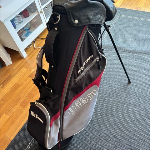 Wilsonin sininen golfbägi. Vetoketjun sauma on korjattu tuotteessa. Bägissä on kankaassa hieman kulumaa. Musta huppu mukana, mutta kulumaa hieman kankaan tavoin.