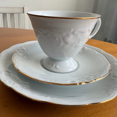 Posliininen valkoinen kahviastiasto kullanvärisillä yksityiskohdilla