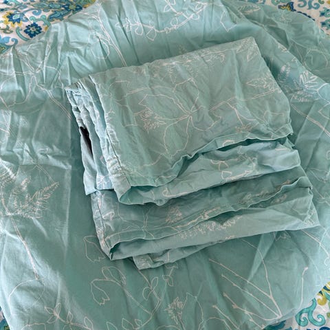 Polyesteri satiinilakanat. 1 tyynyliina ja 1 pussilakana. Muutama langannousu siellä täällä, mutta muuten hyvässä kunnossa.