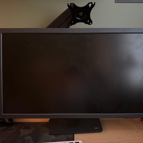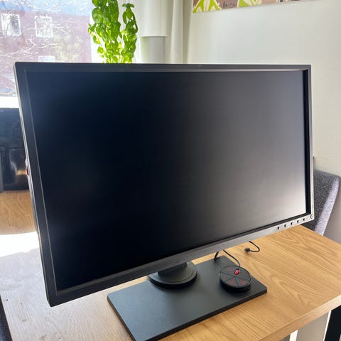 BenQ Zowie pelinäyttö, arviolta noin 24 tuuman kokoinen, musta etupaneeli ja harmaa jalusta punaisilla yksityiskohdilla. Näytössä on säädettävä jalusta, jonka avulla korkeutta ja kallistusta voi muokata. Sopii pöytäkoneen näytöksi pelaamiseen ja yleiseen tietokoneen käyttöön. Liitännät ja tarkemmat tekniset tiedot eivät käy ilmi kuvista.