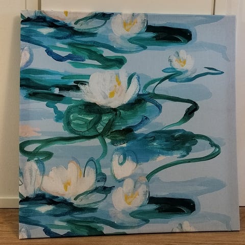 Södermanland VTT Hälcos seinätaulu, jossa kuvattuna lumpeenkukkia ja lumpeenlehtiä sinisellä taustalla. Taulu on suorakaiteen muotoinen ja siinä on kiinnityskoukku takana seinälle ripustamista varten. Materiaali on kovalevyn tai vastaavan levyisen pohjan päälle toteutettu koristepinta metallinhohtoisilla kuvioilla. Sopii sisustuselementiksi esimerkiksi olohuoneeseen, makuuhuoneeseen tai eteiseen.