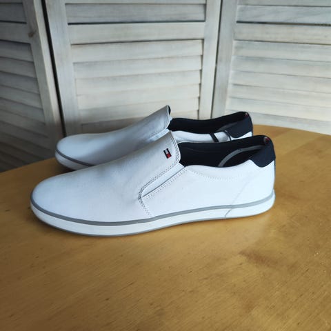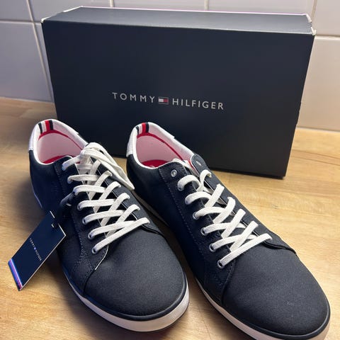 Tommy Hilfiger TH Court tennarit, koko 46. Väriltään valkoiset, tummanharmaalla kantapääosalla. Päällinen nahkajäljitelmää (leather-grain), nauhakiinnitys. Vuori ja pohjallinen tekstiilimateriaalia. Kumipohja, jossa kuvioitu pinta. Sopivat arkikäyttöön ja vapaa-aikaan.