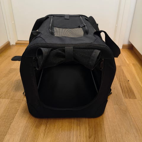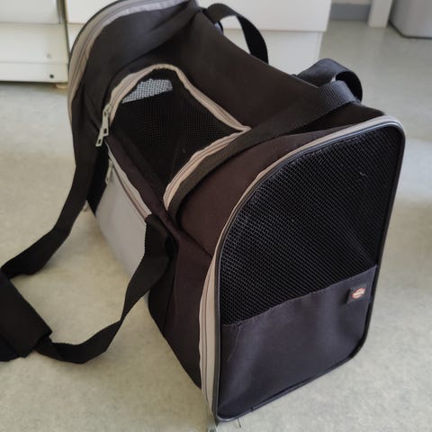 Harmaa-musta lemmikkikuljetuslaukku pienille eläimille. Laukussa on useita verkkopaneeleita ilmanvaihtoa ja näkyvyyttä varten sekä vetoketjullinen etuaukko, joka voidaan avata kokonaan. Laukussa on kantokahvat ja olkahihna helpottamaan kantamista. Soveltuu esimerkiksi kissan tai pienen koiran kuljettamiseen lyhyillä matkoilla, eläinlääkärikäynneillä tai muissa arjen siirtymissä. Vähän käytön jälkijä