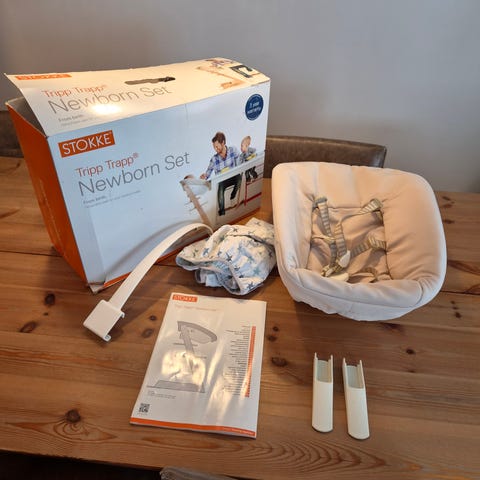 Uudempaa mallia oleva harmaa Stokke Tripp Trapp newborn set. Sisältää istuimen, pehmusteen, viisipistevaljaat ja lelutangon, johon voi kiinnittää oman lelun. 🧸 Lelutangon saa myös irti.