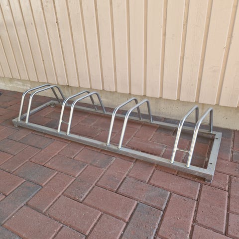 Kuvan metallinen polkupyöräteline neljälle pyörälle, pinnassa vähän ruostetta mutta muuten hyvässä kunnossa. Nouto tai omien menojen mukaan kuljetus Oulun alueella.