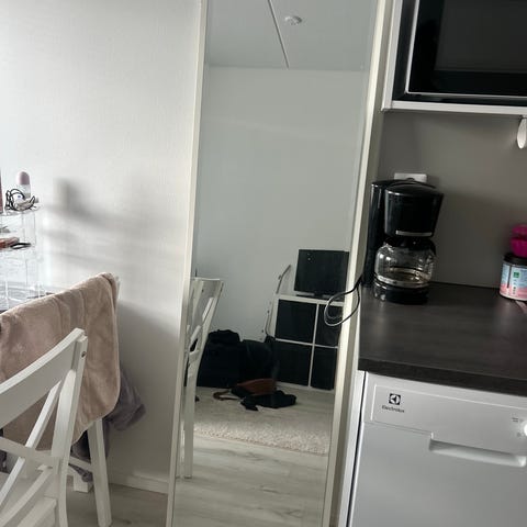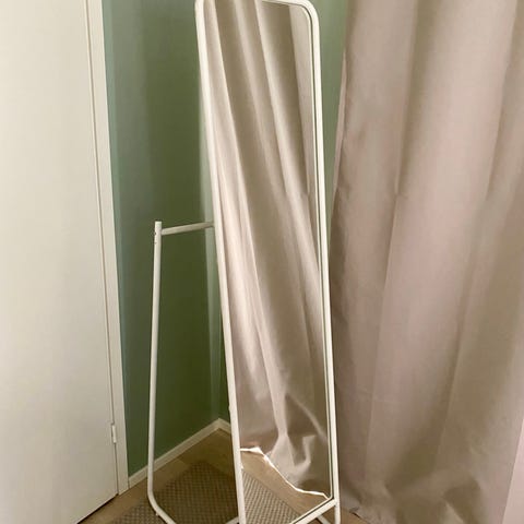 IKEA Knapper kokovartalopeili, jossa valkoinen kehys ja teline. Peili on vapaasti lattialla seisova ja sitä voi siirtää helposti paikasta toiseen. Takapuolella on useita koukkuja.