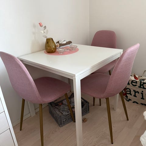 Myydään 3 kappaletta Jyskin JONSTRUP-ruokapöydän tuoleja. Tuoleissa on kaunis vaaleanpunainen kangasverhoilu ja tyylikkäät kullanväriset (messinki) metallijalat.