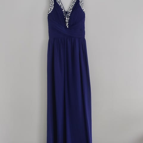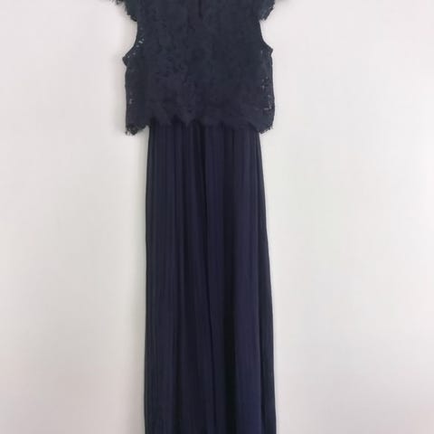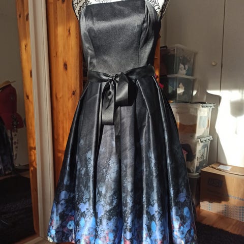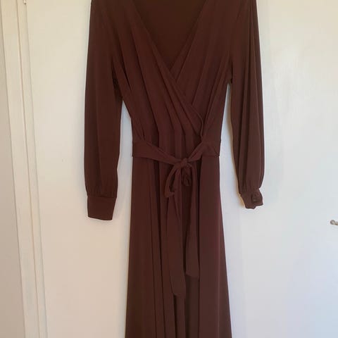 Ruskeaa satiinia juhlamekko. Pitkä viisto helma ja ristikkäin yläosa. Avoin pääntie edestä ja takaa. Mahdollista olkaimista kiristää sisä ompeleen kuminauhaa. Pitkät hihat. Pesty WeatClean. Toridiili.