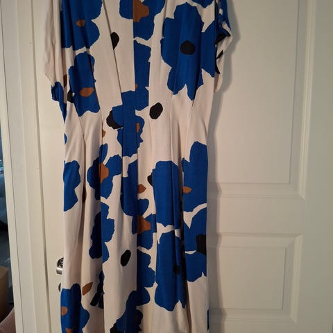 Marimekko naisten mekko, koko 42. Mekossa on kirjava kuosi, jossa suuria sinisiä, ruskeita ja mustia kuvioita vaalealla pohjalla. Lyhythihainen, väljä malli, joka sopii arki- ja juhlakäyttöön. Materiaali ei käy ilmi tiedoista. Mekko ollut pitkä, lyhennetty. 160 cm henkilölle on polven alapuolelle.