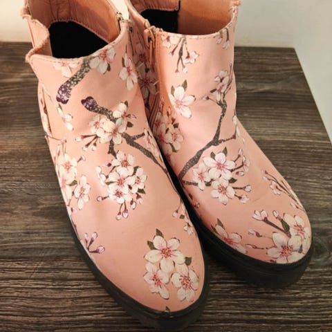 H&M Divided -merkin kukkakuosiset kengät, koko 38. Paksu kumipohja ja vetolenkki takana helpottamassa jalkaan laittoa.