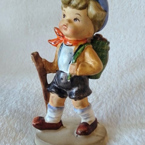 Posliininen poikafiguuri, jossa vaaleat värit ja sinisiä sekä kultaisia yksityiskohtia. Seisoo jalustalla ja sopii hyvin hyllylle tai lipaston päälle koristeeksi.