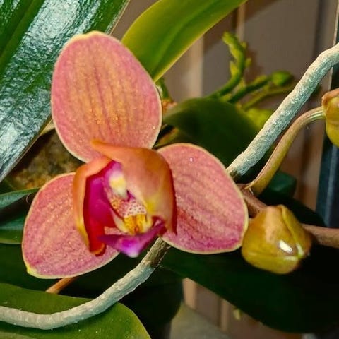 Orkidea ”Delta”, kolmevuotias suuri kasvi, kaskadikasvi, kasvaa 1,5 litran ruukussa, vaatimaton.