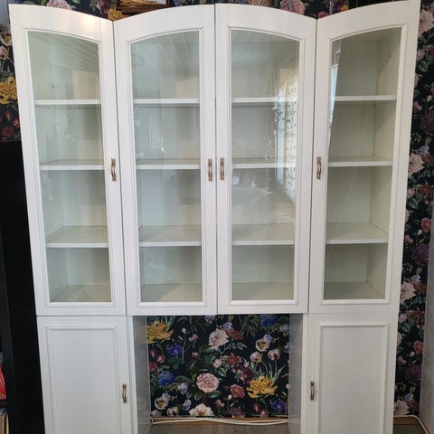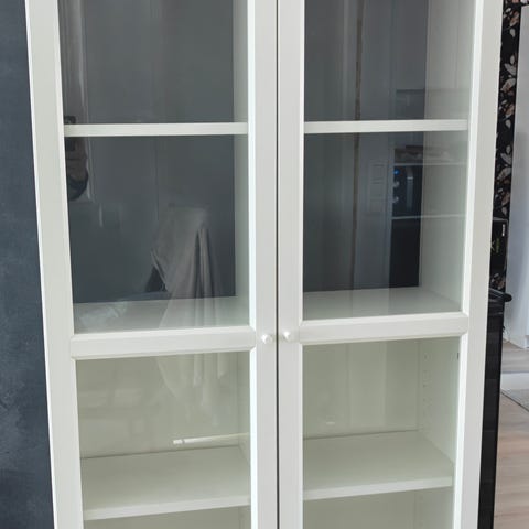 🏠 Hyväkuntoinen IKEA BILLY OLSBO x 2 Kirjahylly+paneeli-vitriiniovi, valkoinen/lasi on myytävänä.