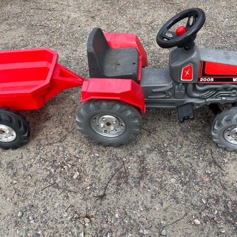 Elämää nähnyt polkutraktori seuraavalle polkijalle. Töötti on hajonnut ja muuten on vähän kulumaa, mutta muuten on ehjä.