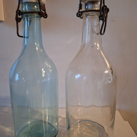2 pulloa, vetoisuus 0,5 litraa. Toimivat patenttikorkit. Aikanaan käytössä olleita. Ehjät. Pullon korkeus 18,5cm.