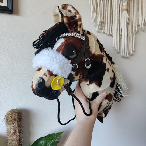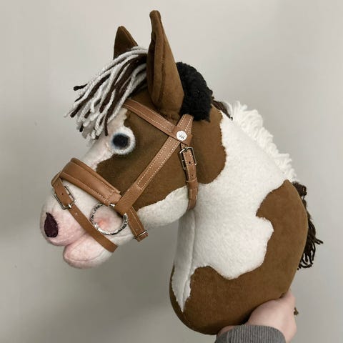 Käsityönä fleecestä valmistettu kirjava keppihevonen.
