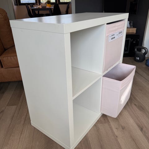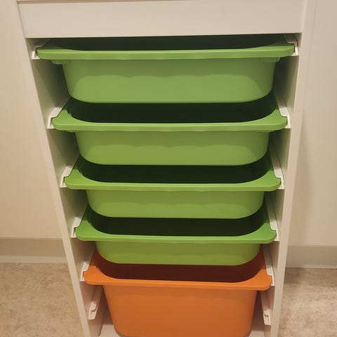 Musta trofast laatikosto, mukana kaksi isoa vaaleanpunaista laatikkoa.