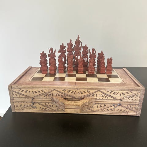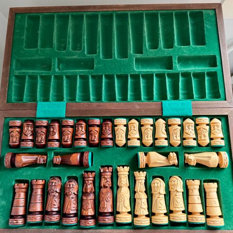 Puinen shakkilauta käsin veistetyillä nappuloilla. Laudassa ja nappuloissa tummat sävyt, nappuloissa kaiverretut yksityiskohdat. Ehjä, mutta kulumaa.