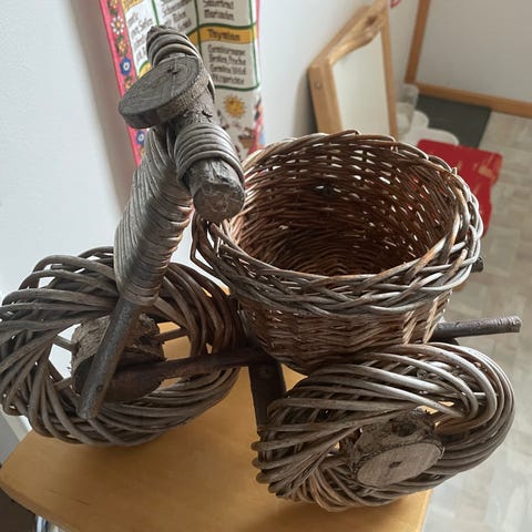 Punottu koristepyörä, jossa pyöreä istutuskori keskellä. Sopii hyvin pihalle tai terassille esimerkiksi kukille tai muille istutuksille. nouto siivikkalasta tai arkipäivisin tampereen härmälästä klo 6-14.30 ehjä.