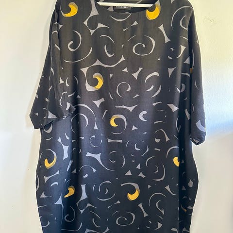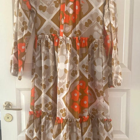 Marimekon Uuma Välly-silkkimekko kokoa S. Beigen sävyinen kirkkaan oransseilla ja kultaisilla kuvioilla. Niskassa nappi. Hihat 3/4 pituiset.