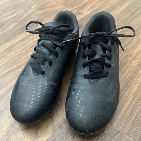 Mustat nappulakengät nauhoituksella. Päällä rei’itettyä pintaa ja sivuilla kuviot, pohjassa nappulat nurmikentälle. Koko 38,5