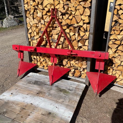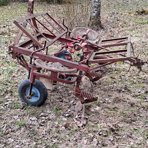 Metsä-Ketelän tekemä perunannistutuskone traktorin perään, kahdella säiliöllä ja kahdelle istuimelle. Metallirunko, ollut navetan suojassa.