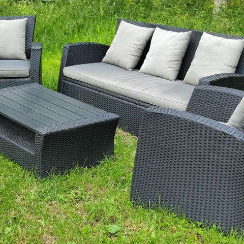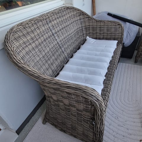 Hyvä käytetty kunto. Pehmusteet tummemmat toiselta puolelta, katso viimeinen kuva. Päälliset haalistuneet auringosta ja pientä kulumaa, mutta ehjät ja veroketjuilla joten voi pestä helposti.