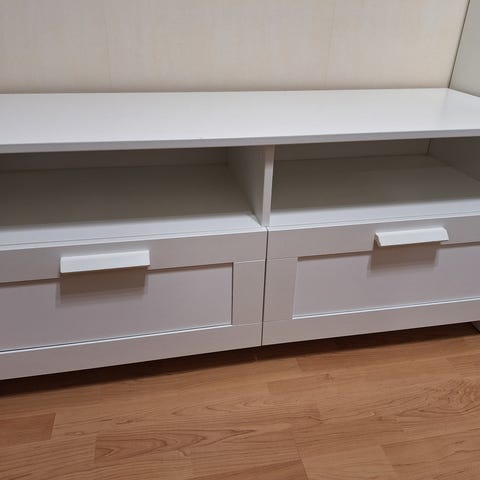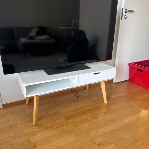 Tammiviilu-valkoinen TV-taso, jossa puiset jalat. Neljä avohylkyä ja kaksi laatikkoa.