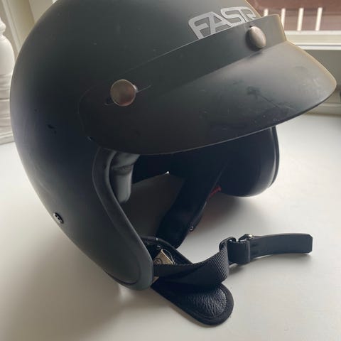 G-Mac avokypärä valkoisena, koko 56-57, edessä tumma visiiri. Leukahihnassa pikasolki ja sisällä pehmusteet.