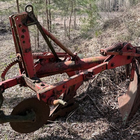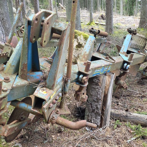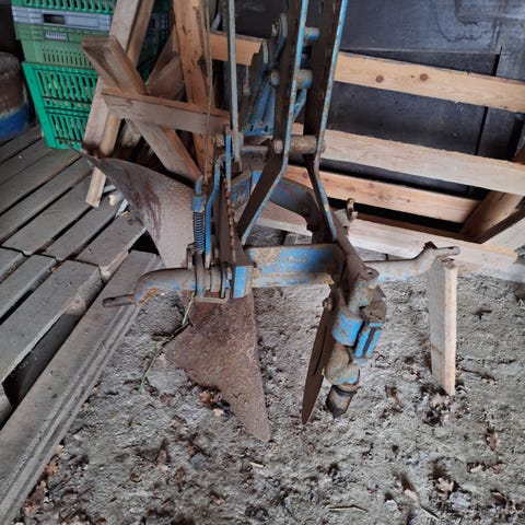 Yksisiipinen aura pienemmän traktorin perään, vedelty harmaa ferkulla. Hyväkuntoinen