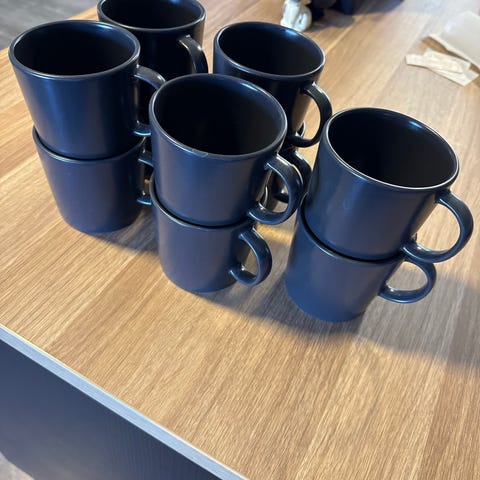 Myydään Iittalan mustia Teema-mukeja 8 kpl, kaikissa korva ja punainen Iittala-logotarra kaikissa paitsi yhdessä.