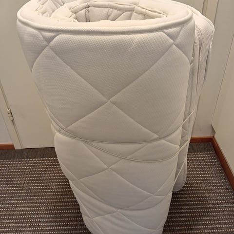 Petauspatja, koko 120x200cm, 5cm korkeus. Alle 1 v käytössä silloin tällöin, sittemmin kaapissa käyttämättömänä. Pieni tahra yhdessä kohdassa.