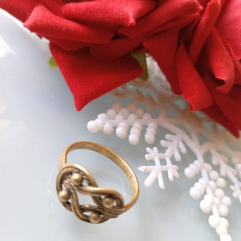Kalevala-sormus naiselle, koristeellinen etuosa ja pyöreitä yksityiskohtia. Sisäpuolella kaiverrus, runko sileä ja kapea.koko noin 20 pronssia