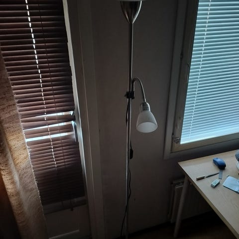 Ikean pitkään palvellut lattiavalaisin joutaa nyt uuteen kotiin järjestyksen muuttuessa kotona. Valo miellyttävän pehmeä ja luo kivaa tunnelmaa. Hyvässä kunnossa muuten, mutta pohjan muovipinta on alkanut vuosien saatossa vähän murentumaan (viimeinen kuva). Esteettistä haittaa tästä ei varsinaisesti ole, vaan päällisin puolin valo on hyvässä kunnossa ja täysin toimiva.