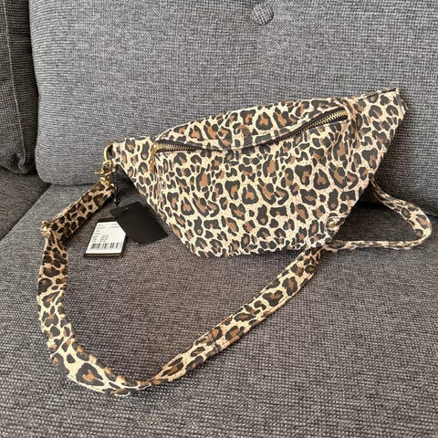 Leopardikuvioinen laukku pitkällä olkahihnalla, kangasta. Vetoketjusulku. Vuori.