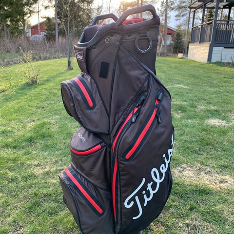 Titleist Cart 14 StaDry on vedenpitävä kärrybägi, jossa on 14-osainen, täyspitkä jakaja, erillinen putteritasku ja integroidut kahvat. Bägissä on vedenpitävä StaDry-rakenne, teipatut saumat ja YKK-vetoketjut. Symmetriseksi suunnitellussa bägissä on tilavavat taskut, mukaan lukien pallotasku ja kaksi juomapullotasku. Mukana on yksinkertainen kantohihna.