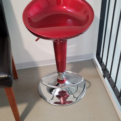 Punaiset baarijakkarat kromatulla jalalla ja jalkatuella.