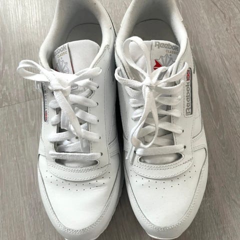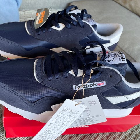 Reebok Classic Nylon -lenkkarit koko 44,5tummansiniset valkoisilla yksityiskohdilla ja nauhakiinnityksellä. Kevyt pohja ja pehmustettu varsi tekevät näistä mukavat jalassa.