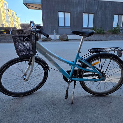 Crescentin 24" vaaleansininen lastenpyörä kukkakuviolla satulassa ja rungossa. Pyörässä on tavarateline ja lokasuojat sekä jalkajarru ja käsijarru edessä.