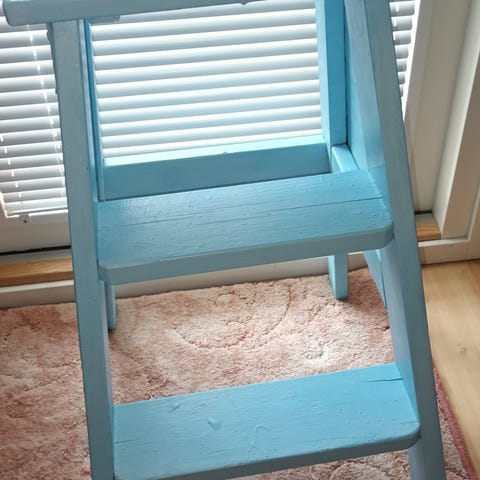 Ikean siniseksi maalattu porrasjakkara. Hieman näkyy käytön jälkeä pinnassa, mutta ehjä ja jämäkkä jakkara.