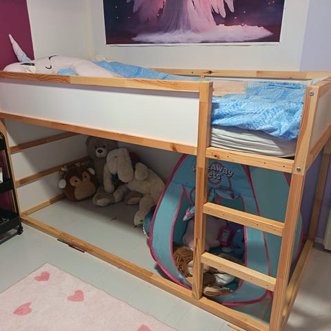Jotain käytön jälkiä löytyy. Sängyn rungossa reijät mihin saa kahvat kiinni. Tällä hetkellä olen irroittanut ne ettei nuorimmainen kiipeäisi sänkyyn, mutta voin laittaa ne takaisin tai antaa mukaan. Portaissa liukueste tarraa. Haku lauantai iltapäivänä Gammelbackasta. Eläin talous (kuvasta näkee myös).
