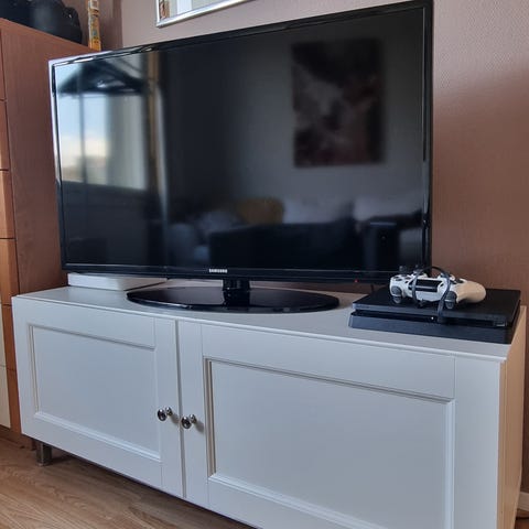 Ikean valkoinen tv-taso. Koira söi vetokahvat, mutta uudet voi asentaa. Pieni kolhu toisen laatikon reunassa ja toisen reunassa pientä kulumaa. Laatikot ehjät. Savuton koirakoti.